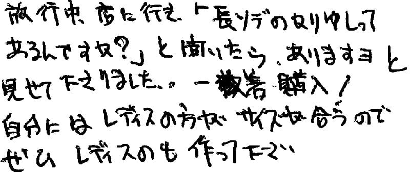 旅行中、店に行き「長ソデのかりゆしってあるんですか?」と聞いたら、ありますヨと見せて下さりました。一着購入!自分にはレディスの方がサイズが合うのでぜひレディスも作って下さい。