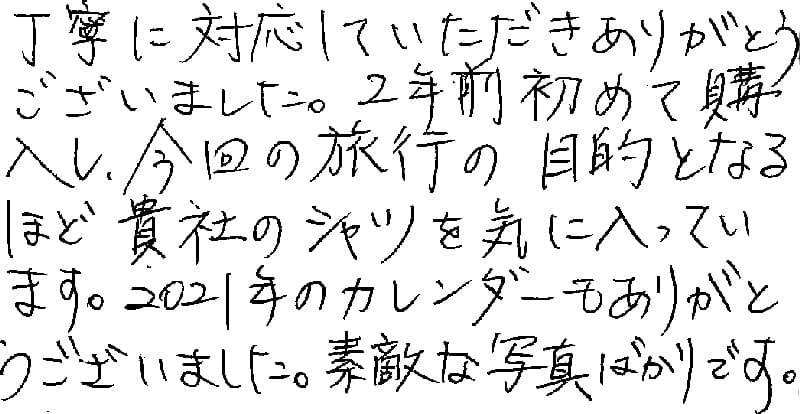 丁寧に対応していただきありがとうございました。2年前初めて購入し、今回の旅行の目的となるほど貴社のシャツを気に入っています。2021年のカレンダーもありがとうございました。素敵な写真ばかりです。
