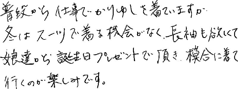 普段から仕事でかりゆしを着ていますが、冬はスーツで着る機会がなく、長袖も欲しくて娘達から誕生日プレゼントで頂き、模合に着て行くのが楽しみです。