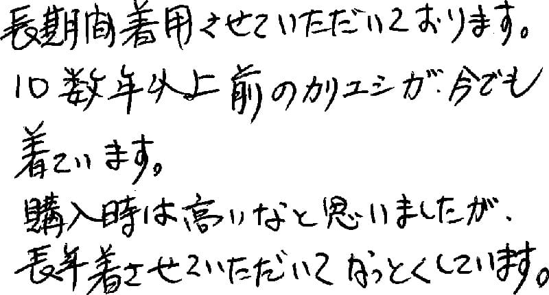 長期間着用させていただいております。10数年以上前のカリユシが今でも着ています。購入時は高いなと思いましたが、長年着させていただいてなっとくしています。