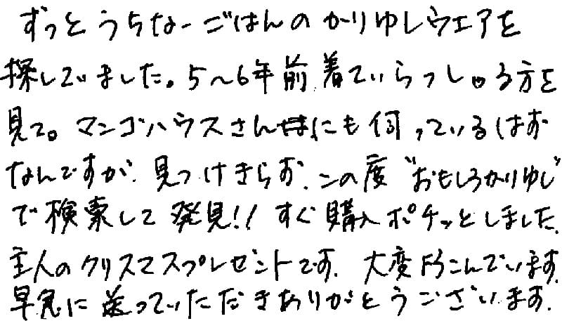 ずっとうちなーごはんのかりゆしウェアを探していました。5~6年前着ていらっしゃる方を見て。マンゴハウスさんにも伺っているはずなんですが、見つけきらず、この度”おもしろかりゆし”で検索して発見!!すぐ購入ポチッとしました。主人のクリスマスプレゼントです。大変よろこんでいます。早急に送っていただきありがとうございます。