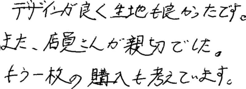 デザインが良く生地も良かったです。また、店員さんが親切でした。もう一枚の購入も考えています。