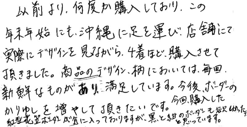 以前より、何度か購入しており、この年末年始にも、沖縄に足を運び、店舗にて実際にデザインを見ながら、4着ほど、購入させて頂きました。商品のデザイン、柄においては、毎回新鮮なものがあり、満足しています。今後、ボーダーのかりゆしを増やして頂きたいです。今回、購入した紅型花笠ボーダーが気に入っておりますが、黒と紺のボーダーも欲しかったと思っています。
