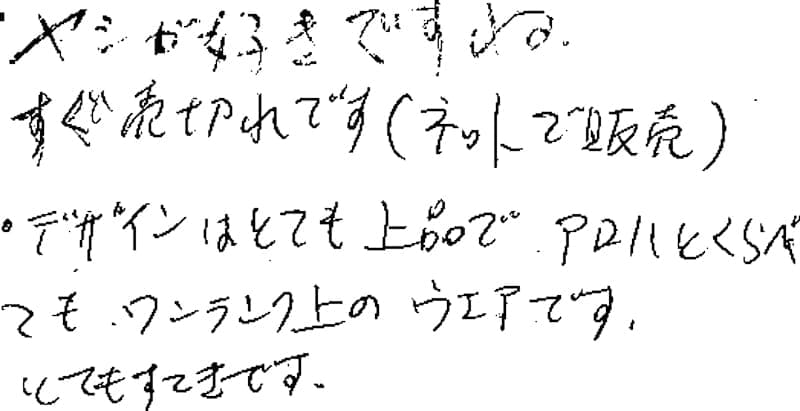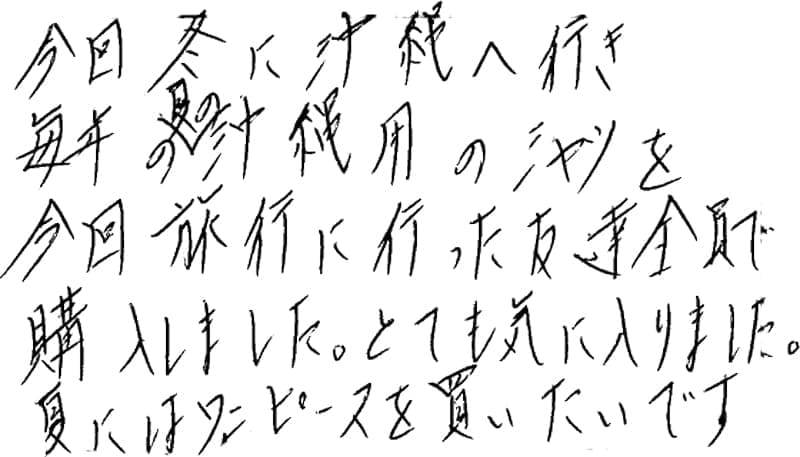 今回冬に沖縄へ行き毎年の夏の沖縄用のシャツを今回旅行に行った友達全員で購入しました。とても気に入りました。夏にはワンピースを買いたいです。