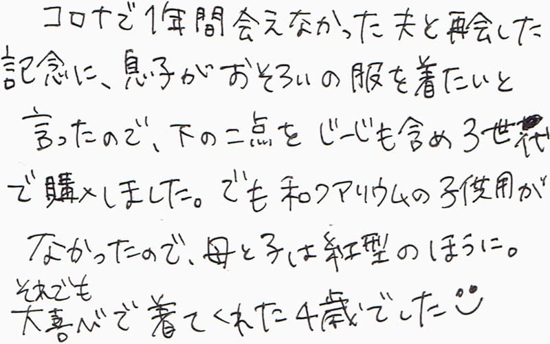 コロナで1年間会えなかった夫と再会した記念に、息子がおそろいの服を着たいと言ったので、下の二点をじーじも含め3世代で購入しました。でも和クアリウムの子供用がなかったので、母と子は紅型のほうに。それでも大喜びで着てくれた4歳でした。