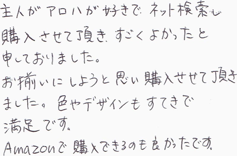 主人がアロハが好きで、ネット検索し購入させて頂き、すごくよかったと申しておりました。お揃いにしようと思い購入させて頂きました。色やデザインもすてきで満足です。Amazonで購入できるのも良かったです。