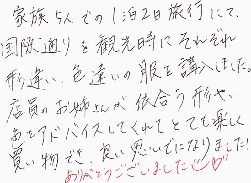家族5人での1泊2日旅行にて、国際通りを観光時にそれぞれ形違い、色違いの服を購入しました。店員のお姉さんが似合う形や、色をアドバイスしてくれてとても楽しく買い物でき、良い思いでになりました!ありがとうございました。