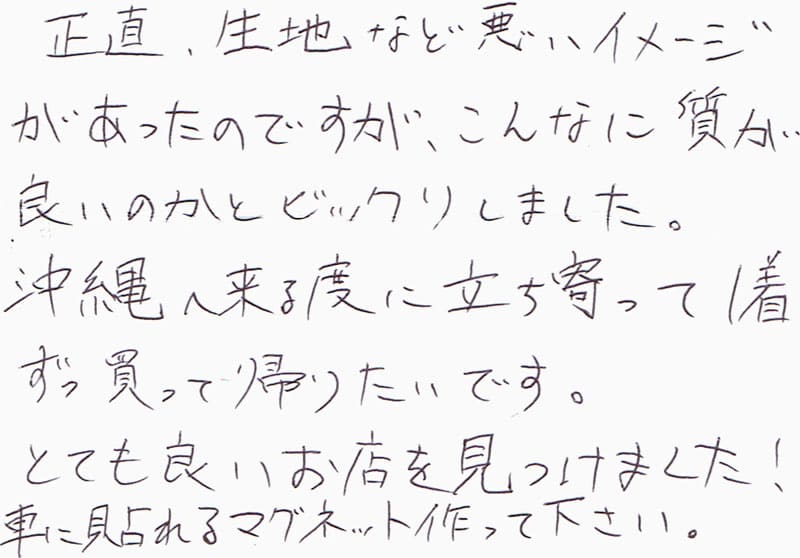 正直、生地など悪いイメージがあったのですが、こんなに質が良いのかとビックリしました。沖縄へ来る度に立ち寄って1着ずつ買って帰りたいです。とても良いお店を見つけました!車に貼れるマグネット作って下さい。