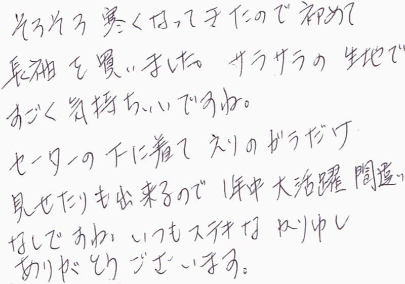 そろそろ寒くなってきたので初めて長袖を買いました。サラサラの生地ですごく気持ちいいですね。セーターの下に着てえりのガラだけ見せたりも出来るので1年中大活躍間違いなしですね。いつもステキなかりゆしありがとうございます。