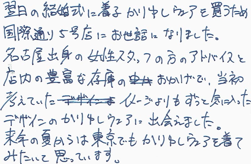 翌日の結婚式に着るかりゆしウェアを買うため国際通り5号店にお世話になりました。名古屋出身の女性スタッフの方のアドバイスと店内の豊富な在庫のおかげで、当初考えていたイメージよりもずっと気に入ったデザインのかりゆしウェアに出会えました。来年の夏からは東京でもかりゆしウェアを着てみたいと思っています。