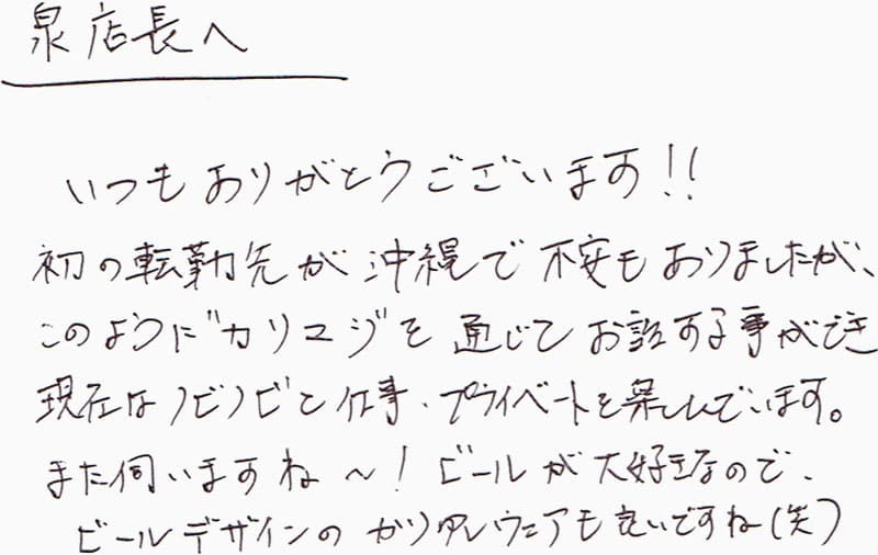 いつもありがとうございます!!初の転勤先が沖縄で不安もありましたが、このように”カリユシ”を通じてお話する事ができ現在はノビノビと仕事、プライベートを楽しんでいます。また伺いますね~!ビールが大好きなので、ビールデザインのかりゆしウェアも良いですね(笑)