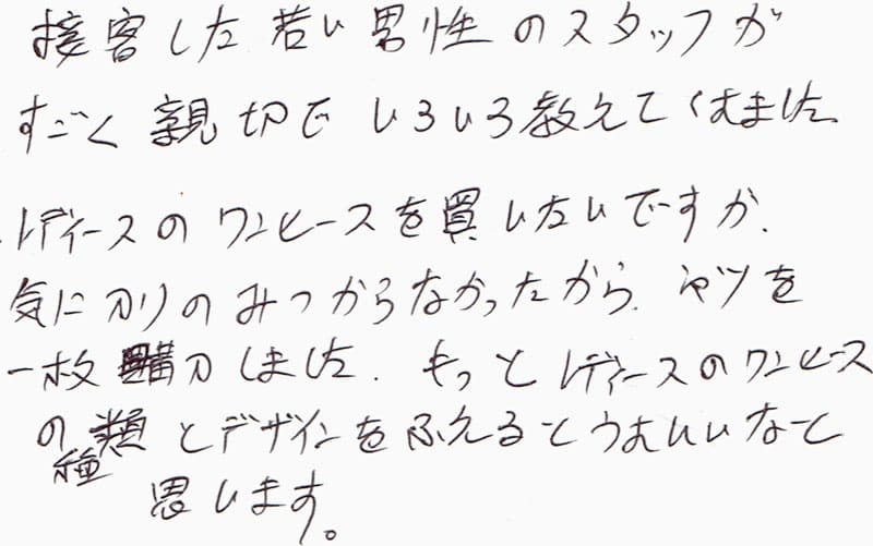 接客した若い男性のスタッフがすごく親切でいろいろ教えてくれました。レディースのワンピースを買いたいですが、気に入りのみつからなかったから、シャツを一枚購入しました。もっとレディースのワンピースの種類とデザインをふえるとうれしいなと思います。