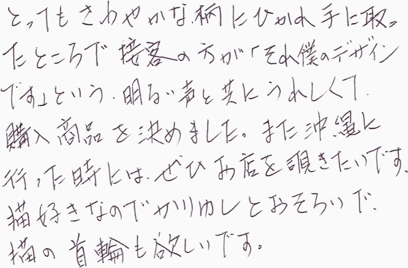 とってもさわやかな柄にひかれ手に取ったところで接客の方が「それ僕のデザインです」という、明るい声と共にうれしくて、購入商品を決めました。また沖縄に行った時には、ぜひお店を覗きたいです。猫好きなのでかりゆしとおそろいで、猫の首輪も欲しいです。