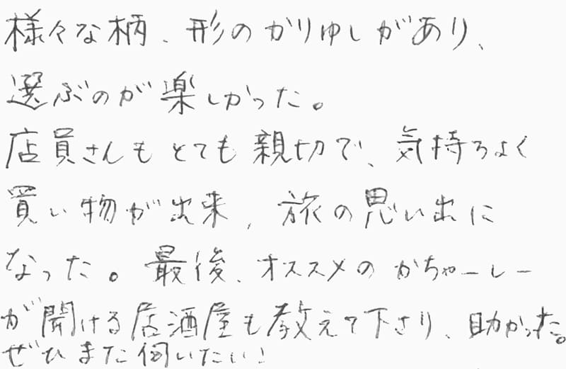 - 様々な柄・形のかりゆしがあり、選ぶのが楽しかった。