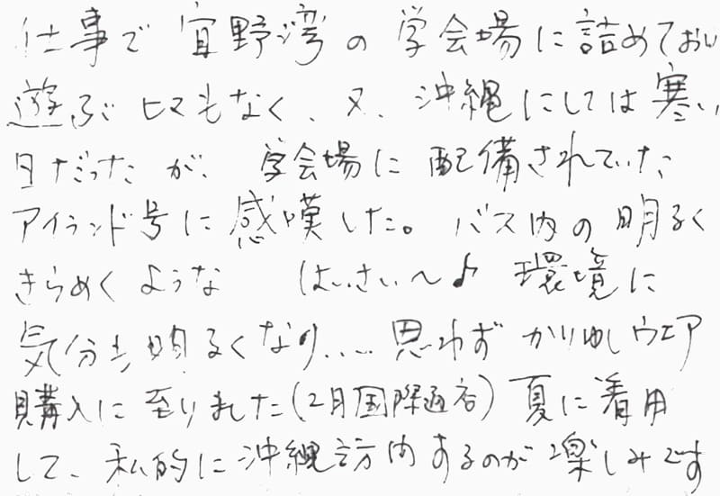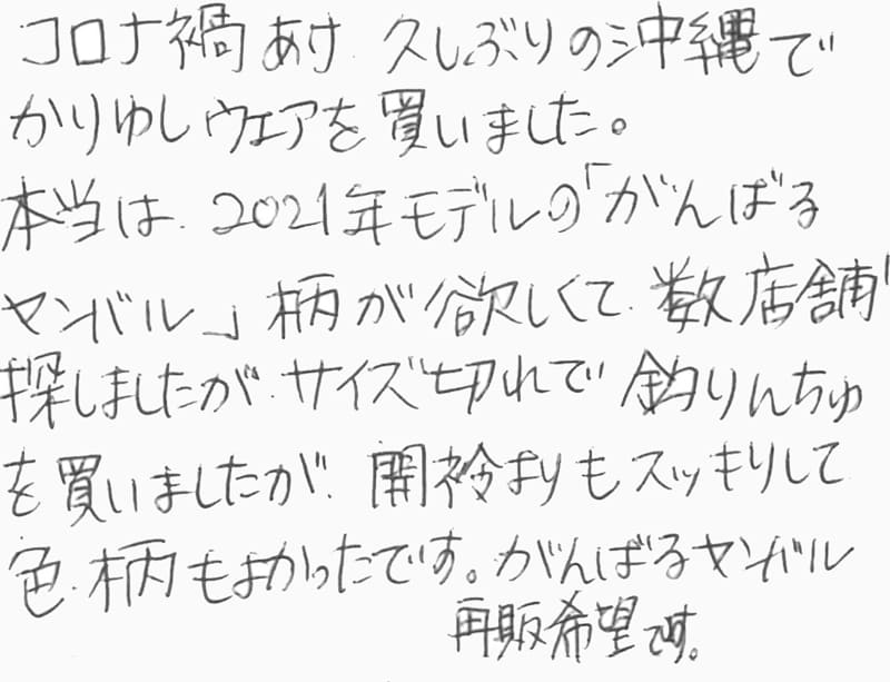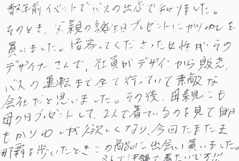 数年前イベントでバスの出店で知りました。そのとき、父親の誕生日プレゼントにかりゆしを買いました。接客してくださった女性がそのデザイナーさんで、社員がデザインから販売、バスの運転まで全て行っていて素敵な会社だと思いました。その後、母親にも母の日プレゼントして、2人で着ているのを見て自分もかりゆしが欲しくなり、今回たまたま那覇を歩いたときこの商品に出会い買いました。3人で沖縄で着たいです!!!