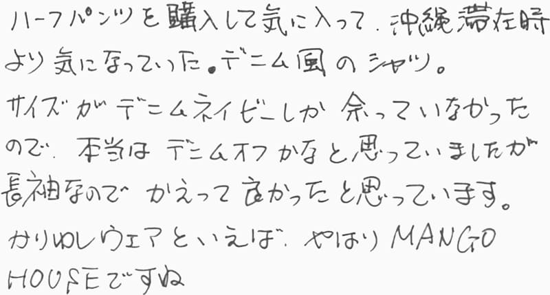 ハーフパンツを購入して気に入って、沖縄滞在時より気になっていた。デニム風のシャツ。サイズがデニムネイビーしか余っていなかったので、本当はデニムオフかなと思っていましたが長袖なのでかえって良かったと思っています。かりゆしウエアといえばやはりMANGOHOUSEですね。