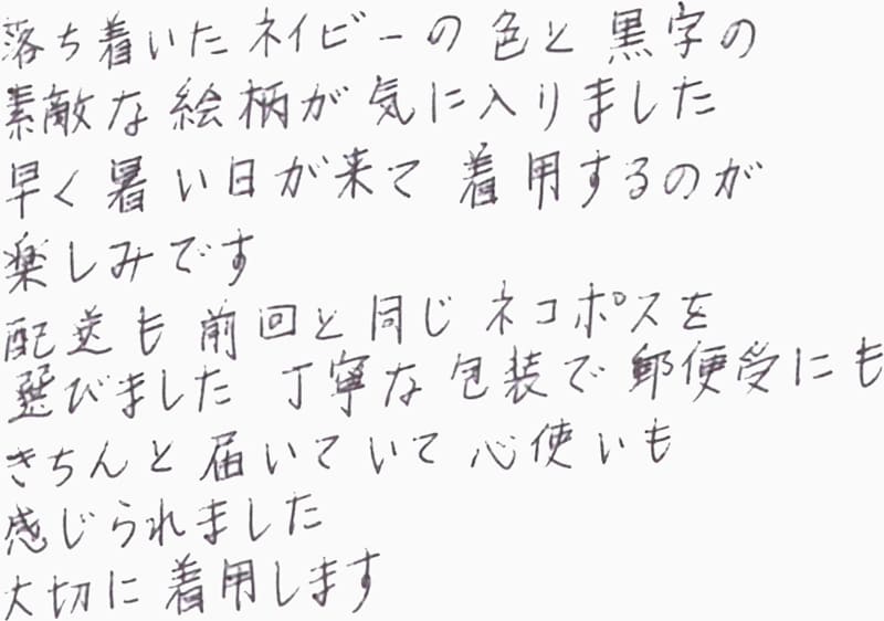 落ち着いたネイビーの色と黒地の素敵な絵柄が気に入りました 早く暑い日が来て着用するのが楽しみです 配送も前回と同じネコポスを選びました 丁寧な梱包で郵便受けにもきちんと届いて心使いも感じられました 大切に着用します