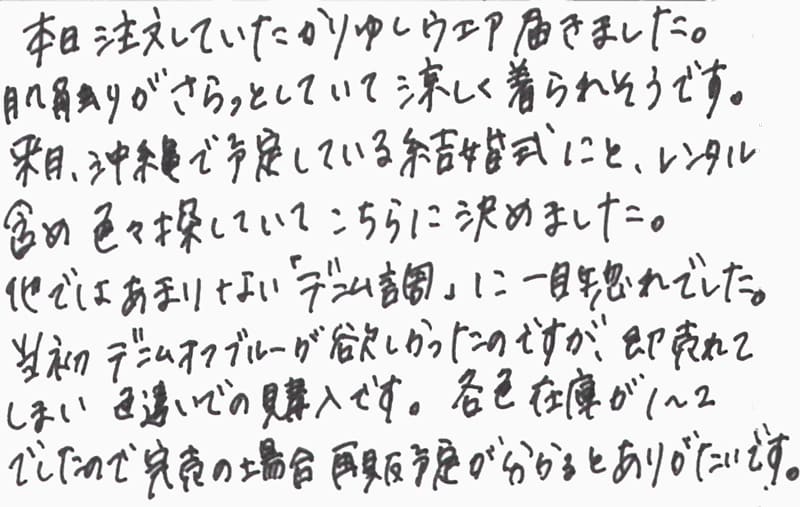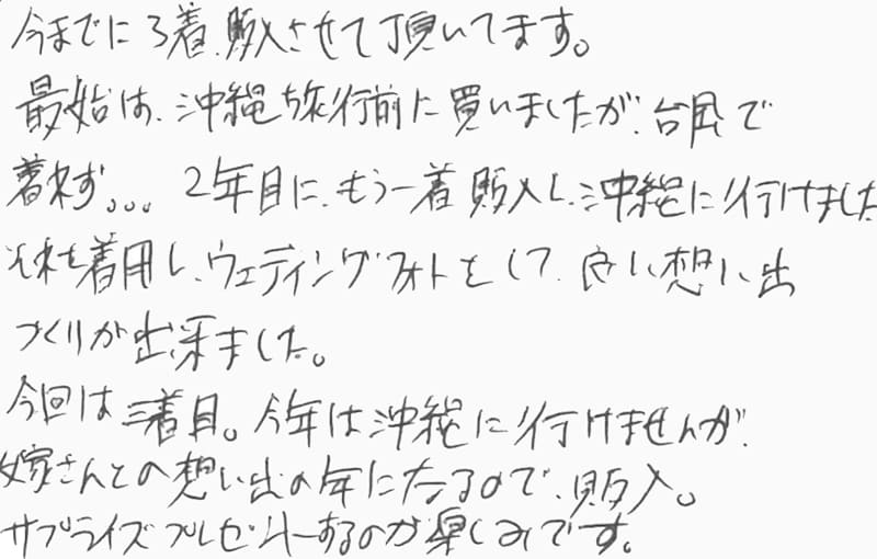 今までに3着購入させて頂いてます。最後は、沖縄旅行前に買いましたが台風で着れず。。。2年目に、もう一着購入し、沖縄に行けました。それを着用し、ウエディングフォトをして、良い想い出づくりが出来ました。三着目。今年は沖縄に行けませんが、嫁さんとの想い出の年になるので購入。サプライズプレゼントするのが楽しみです。