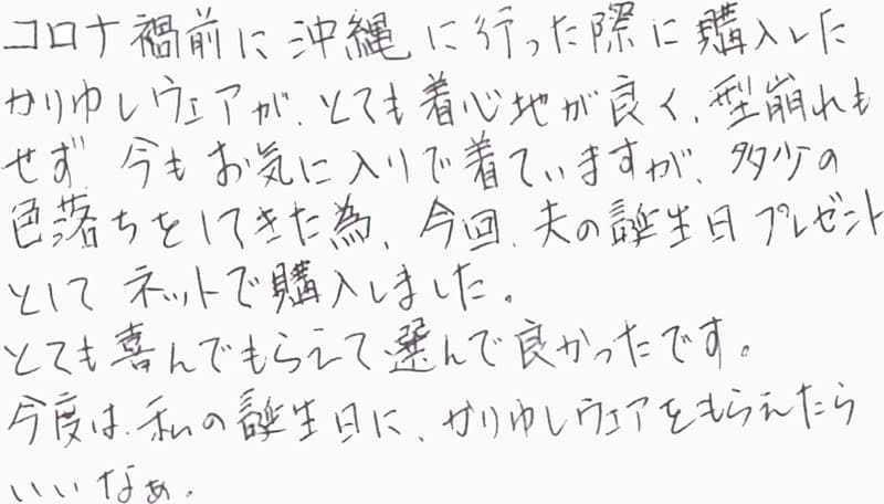 コロナ禍前に沖縄に行った際に購入したかりゆしウエアがとても着心地が良く、型崩れもせず今もお気に入りで着ていますが、多少の色落ちをしてきた為、今回夫の誕生日プレゼントとしてネットで購入しました。とても喜んでもらえて選んで良かったです。今度は私の誕生日に、かりゆしウエアをもらえたらいいなぁ。