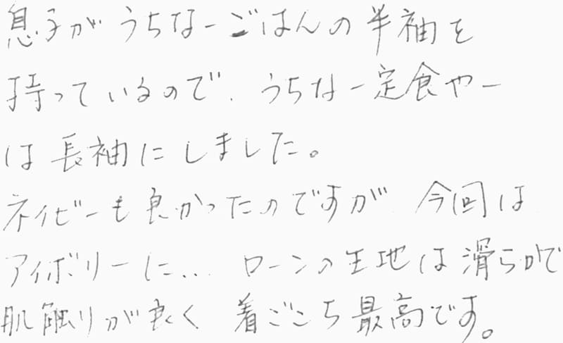 息子がうちなーごはんの半袖を持っているので、うちなー定食やーは長袖にしました。ネイビーも良かったのですが、今回はアイボリーに…ローンの生地は滑らかで肌触りが良く着ごこち最高です。
