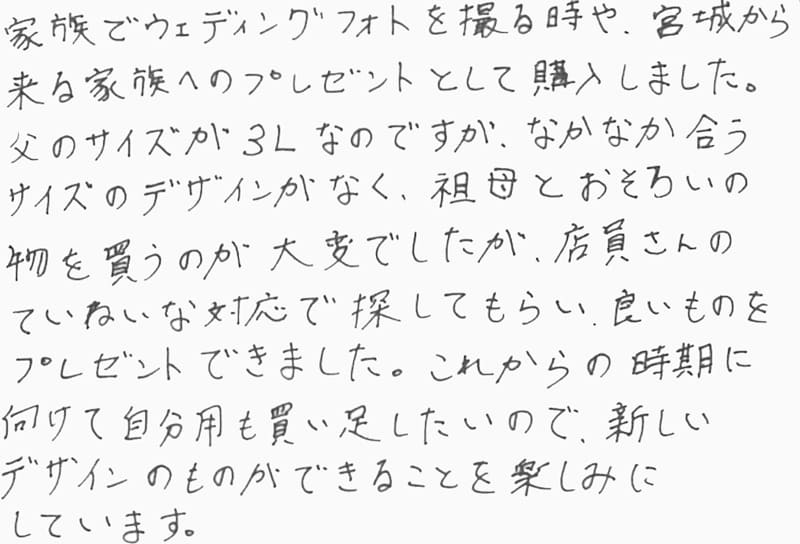 家族でウェディングフォトを撮る時や、宮城からくる家族へのプレゼントとして購入しました。父のサイズが3Lなのですが、なかなか合うサイズのデザインがなく、祖母とおそろいの物を買うのが大変でしたが、店員さんのていねいな対応で探してもらい良いものをプレゼントできました。これからの時期に向けて自分用も買い足したいので新しいデザインのものができることを楽しみにしています。