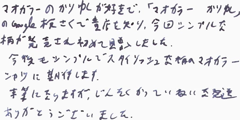 マオカラーのかりゆしが好きで、「マオカラー かりゆし」のGoogle検さくで貴店を知り、今回シンプルな柄が発売され初めて購入しました。今後もシンプルでスタイリッシュな柄のマオカラーシャツに期待します。末筆になりますが、じんそくかつていねいな発送ありがとうございました。