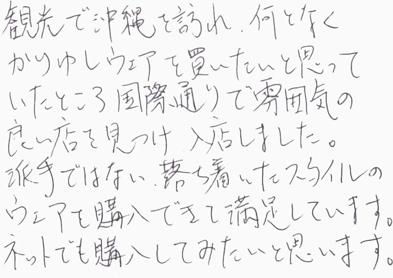 観光でお沖縄を訪れ、何となくかりゆしウエアを買いたいと思っていたところ、国際通りで雰囲気の良い店を見つけ入店しました。派手ではない落ち着いたスタイルのウエアを購入できて満足しています。ネットでも購入してみたいと思います。