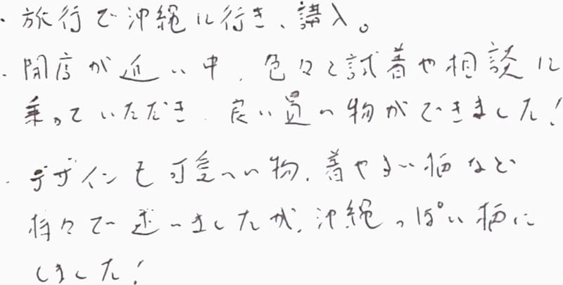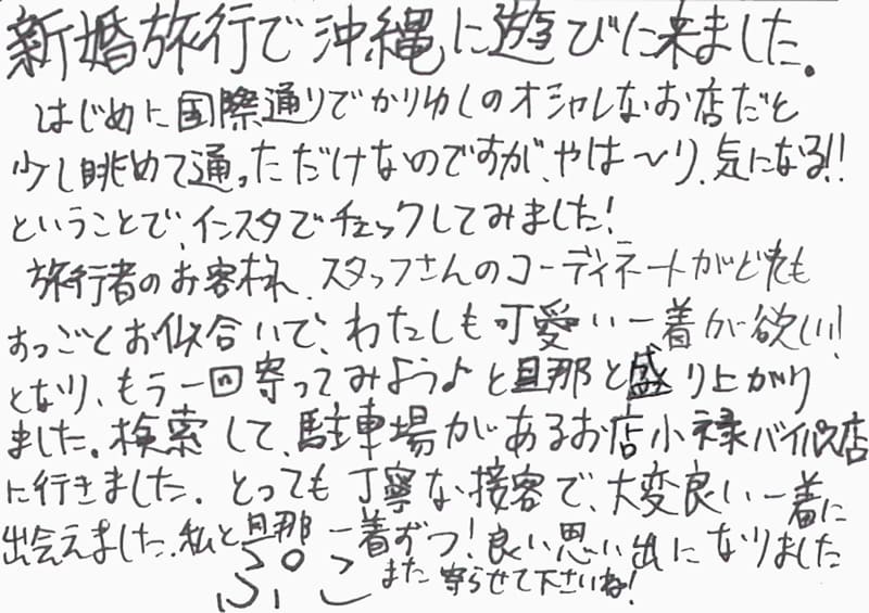 新婚旅行で沖縄に遊びに来ました。はじめに国際通りでかりゆしのオシャレなお店だと少し眺めて通っただけなのですが、やは~り、気になる!!ということで、インスタでチェックしてみました!旅行者のお客様、スタッフさんのコーディネートがどれもすごくお似合いで、わたしも可愛い一着が欲しい!となり、もう一回寄ってみよう♪と旦那と盛り上がりました。検索して、駐車場があるお店小禄バイパス店に行きました。とても丁寧な接客で、大変良い一着に出会えました。私と旦那一着ずつ!良い思い出になりました。また寄らせて下さいね!