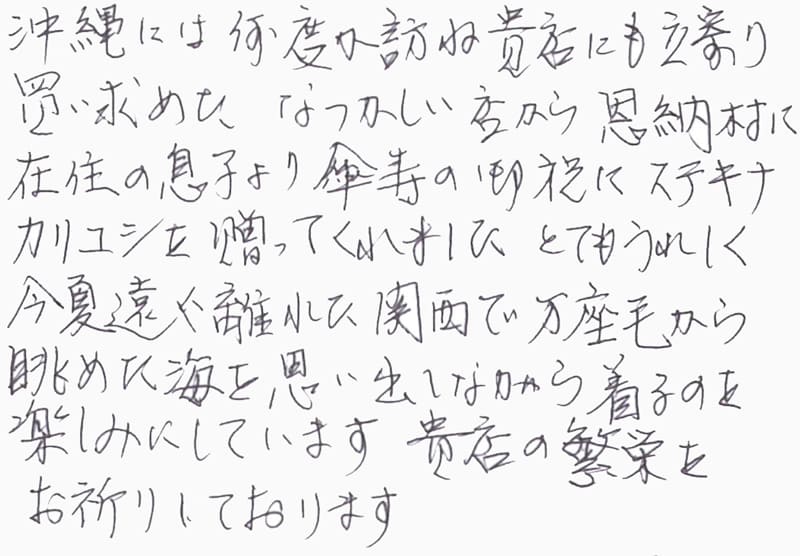 沖縄には何度か訪ね貴店にも立寄り買い求めた。なつかしい店から恩納村に在住の息子より傘寿の御祝にステキナカリユシを贈ってくれました。とてもうれしく今年遠く離れた関西で万座毛から