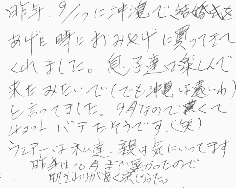 昨年9/17に沖縄で結婚式をあげた時におみやげに買ってきてくれました。息子達は楽しんで来たみたいで(でも沖縄は遠いわ)と言ってました。9月なので暑くてチョットバテたそうです(笑)ウエアーは私達、親は気にってます。昨年は10月まで暑かったので肌さわりが良く涼しかった。