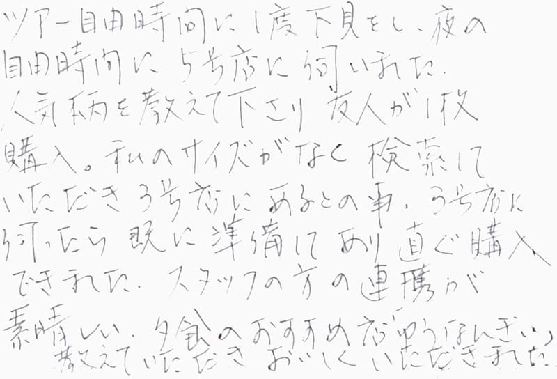 ツアー自由時間に1度下見をし、夜の自由時間に5号店に伺いました。人気柄を教えて下さり友人が1枚購入。私のサイズがなく検索していただき3号店にあるとの事。3号店に伺ったら既に準備してあり直ぐ購入できました。スタッフの方の連携が素晴らしい、夕飯のおすすめ店「ゆうなんぎい」教えていただきおいしくいただきました。