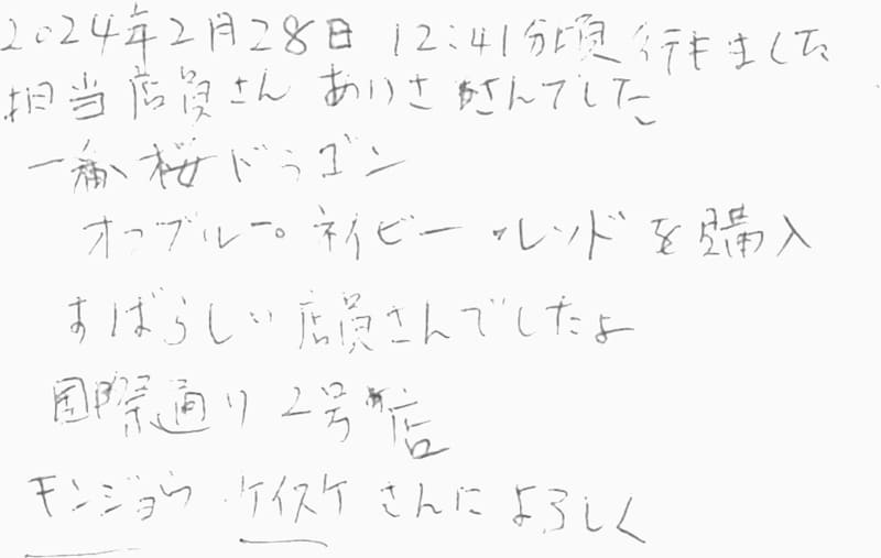 2024年2月28日12:41分頃行きました。担当店員さんありささんでした。一番桜ドラゴン オフブルー・ネイビー・レッドを購入。 すらばしい店員さんでしたよ。国際通り2号店キンジョウ・ケイスケさんによろしく