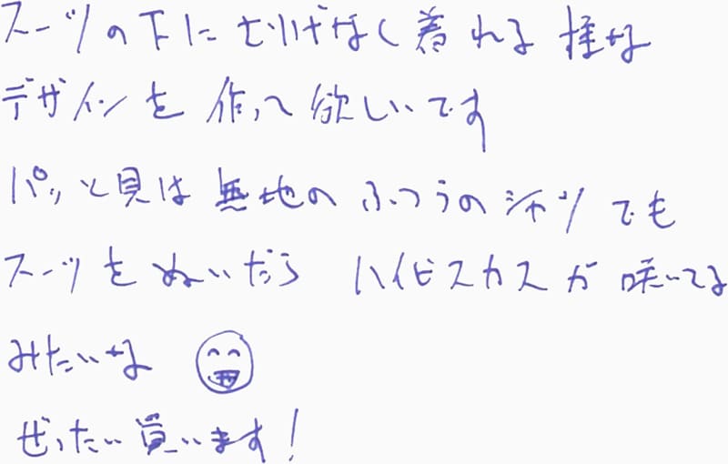 - スーツの下にさりげなく着れる様なデザインを作って欲しいです。