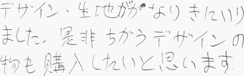 デザイン・生地がかなりきにいりました。是非ちがうデザインの物も購入したいと思います。