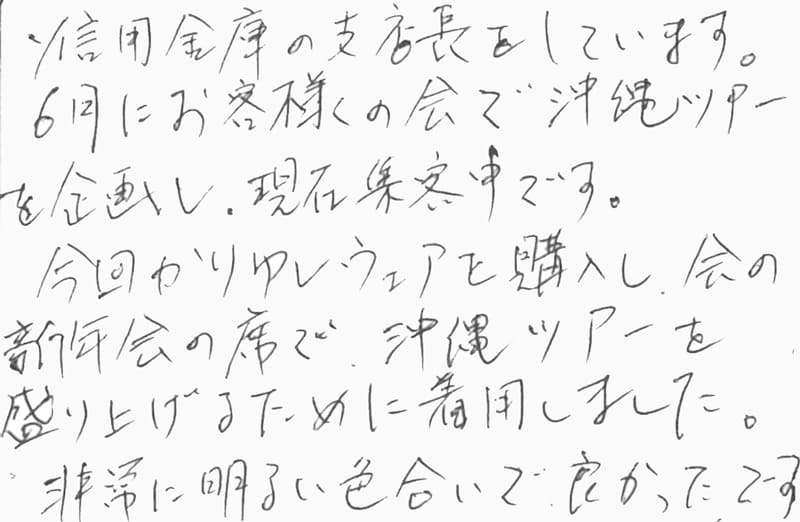 信用金庫の支店長をしています。6月にお客様の会で沖縄ツアーを企画し、現在集客中です。今回かりゆしウエアを購入し、会の新年会の席で沖縄ツアーを盛り上げるために着用しました。非常に明るい色合いで良かったです。