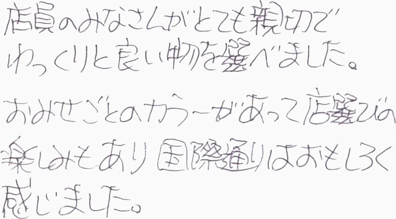 店員のみなさんがとても親切でゆっくりと良い物を選べました。おみせごとのカラーがあって店選びの楽しみもあり国際通りはおもしろく感じました。