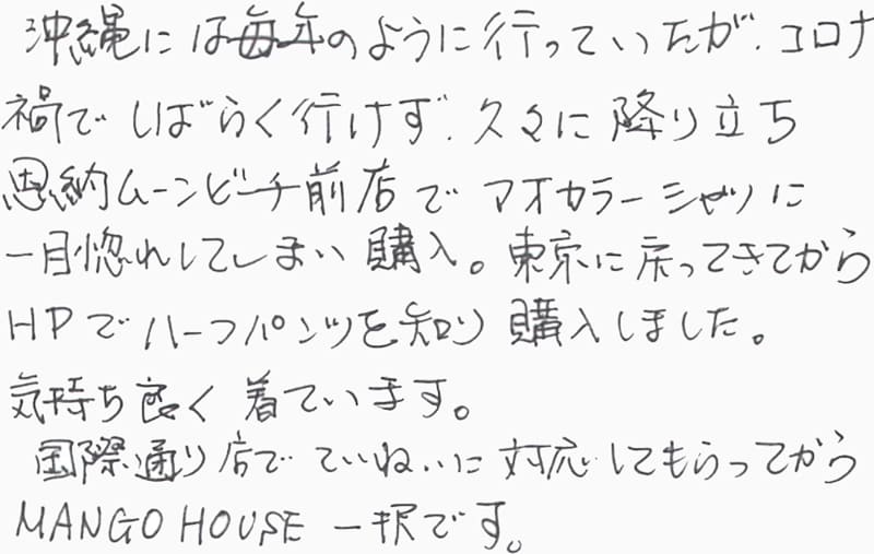沖縄には毎年のように行っていたが、コロナ禍でしばらく行けず、久々に降り立ち恩納ムーンビーチ前店でマオカラーシャツに一目惚れしてしまい購入。東京に戻ってきてからHPでハーフパンツを知り購入しました。気持ち良く着ています。国際通り店でていねいに対応してもらってからMANGOHOUSE一択です。