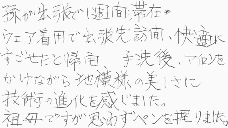 孫が出張で1週間滞在。ウェア着用で出張先訪問、快適に過ごせたと帰宅、手洗後、アイロンをかけながら地模様の美しさに技術の進化を感じました。祖母ですが思わずペンを握りました。