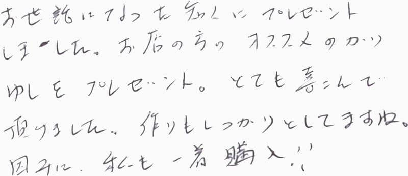 お世話になった知人にプレゼントしました。お店の方のオススメのかりゆしをプレゼント。とても喜んで頂けました。作りもしっかりとしてますね。因みに、私も一着購入!!