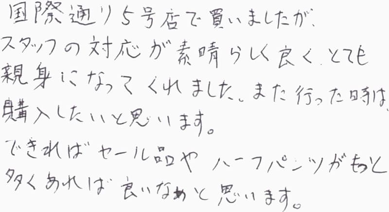 国際通り5号店で買いましたが、スタッフの対応が素晴らしく良くとても親身になってくれました。また行った時は、購入したいと思います。できればセール品やハーフパンツがもっと多くあれば良いなぁと思います。