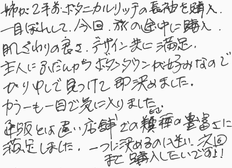 姉が2年前ボタニカルリッチの長袖を購入 一目ぼれして、今回、旅の途中に購入 肌ざわりの良さ、デザイン共に満足 主人にふだんからボタンダウンが好みなのでかりゆしで見つけて即決めました。 カラーも一目で気に入りました 通販とは違い店舗での種類の豊富さに満足しました。一つに決めるのに迷い、次回まで購入したいです!!