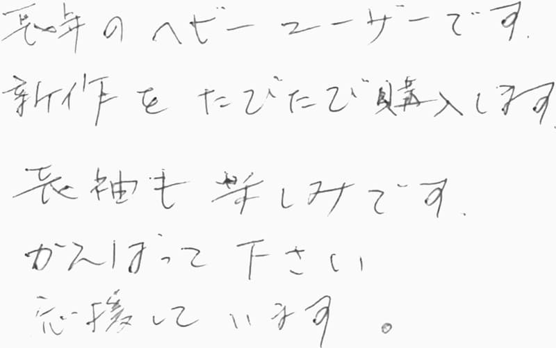 長年のヘビーユーザーです。新作をたびたび購入します。長袖も楽しみです。がんばって下さい 応援しています。