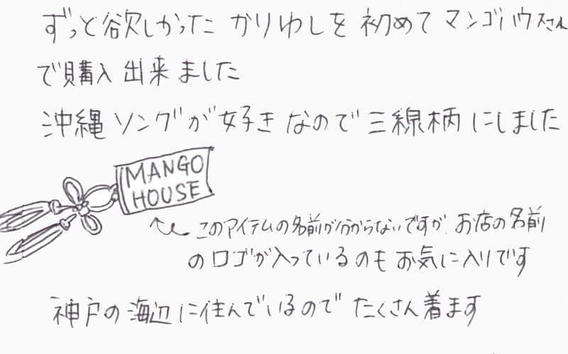 ずっと欲しかったかりゆしを初めてマンゴハウスさんで購入出来ました 沖縄ソングが好きなので三線柄にしました このアイテムの名前が分からないですが、お店の名前のロゴが入っているのもお気に入りです 神戸の海辺に住んでいるのでたくさん着ます