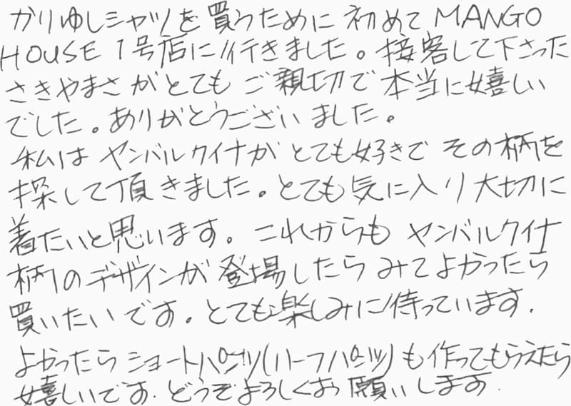 かりゆしシャツを買うために初めてMANGOHOUSE1号店に行きました。接客して下さったさきやまさんがとてもご親切で本当に嬉しいでした。ありがとうございました。私はヤンバルクイナがとても好きでその柄を探して頂きました。とても気に入り大切に着たいと思います。これからもヤンバルクイナ柄のデザインが登場したらみてよかったら買いたいです。とても楽しみに待っています。よかったらショートパンツ(ハーフパンツ)も作ってもらえたら嬉しいです。どうぞよろしくお願いします。
