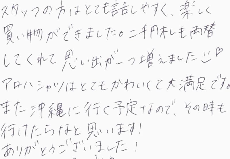 スタッフの方はとても話しやすく、楽しく買物ができました。2千円札も両替してくれて思い出が一つ増えました^-^♡アロハシャツはとてもかわいくて大満足です。また沖縄に行く予定なので、その時も行けたらなと思います!ありがとうございました!