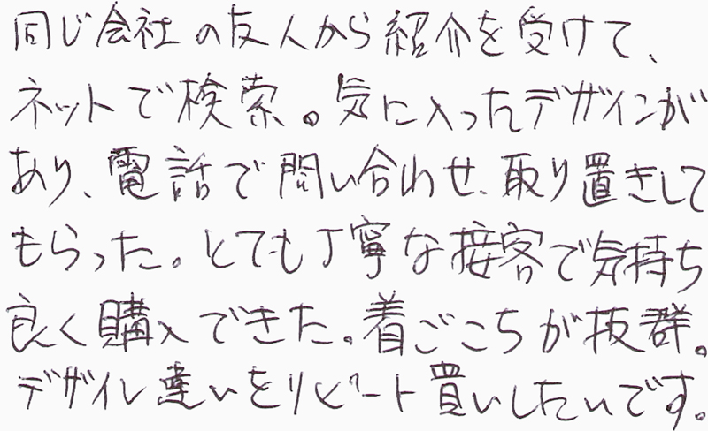 同じ会社の友人から紹介を受けて、ネットで検索。気に入ったデザインがあり、電話で問い合わせ取り置きしてもらった。とても丁寧な接客で気持ち良く購入できた。着ごこちが抜群。デザイン違いをリピート買いしたいです。
