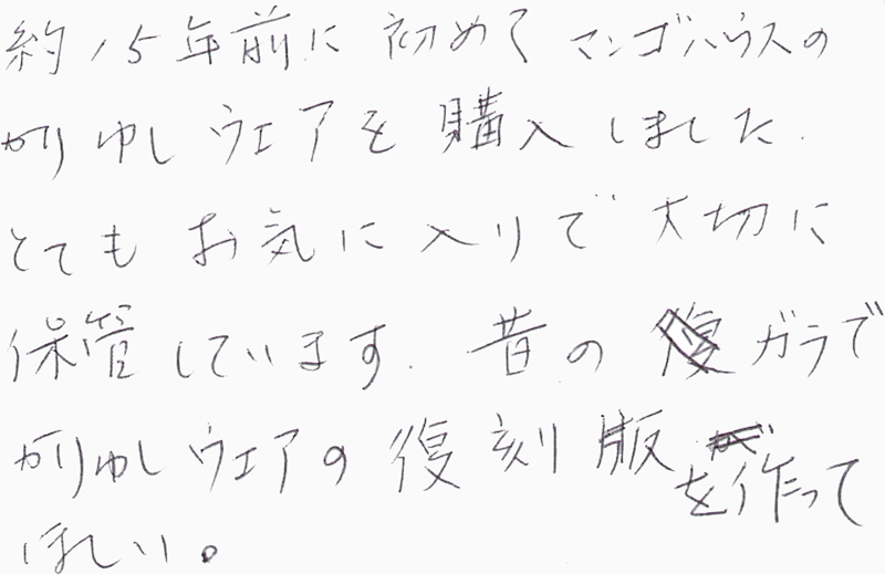 約15年前に初めてマンゴハウスのかりゆしウエアを購入しました。とてもお気に入りで大切に保管しています。昔のガラでかりゆしウエアの復刻版を作ってほしい。