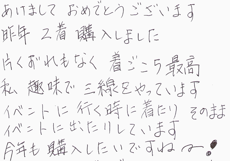 あけましておめでとうございます 昨年2着購入しました 片くずれもなく着ごこち最高 私 趣味で三線をやっています イベントに行く時に着たり そのままイベントに出たりしています 今年も購入したいですね~!