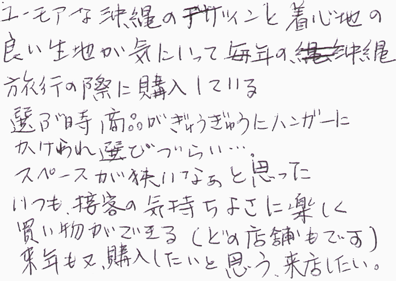ユーモアな沖縄のデザインと着心地の良い生地が気にいって毎年の沖縄旅行の際に購入している 選ぶ時 商品がぎゅうぎゅうにハンガーにかけられ選びづらい・・・。スペースが狭いなぁと思た いつも、接客の気持ちよさに楽しく買い物ができる(どの店舗もです)来年も又、購入したいと思う、来店したい。