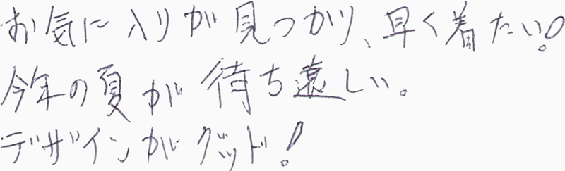 お気に入りが見つかり、早く着たいです!今年の夏が待ち遠しい。デザインがグッド!